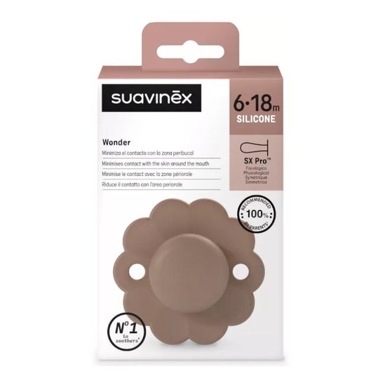 Suavinex Wonder SX Pro Chupete de Silicone 6-18M Raw Umber 1ud é um chupete que respeita o desenvolvimento bucal do bebé. Elaborado com tetina fisiológica SX Pro de silicone arenoso ultra-suave que imita na textura e consistência o mamilo materno. Além disso, possui um escudo redondo ergonómico e convexo que permite a circulação de ar entre o chupete e as fossas nasais. Chupete para bebés de 6 a 18 meses.
