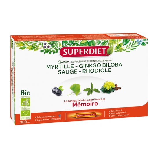 Combinação de 4 extractos de plantas: a bacopa melhora a memória e a concentração, a rhodiola aumenta o desempenho intelectual, o ginkgo biloba e a salva espanhola completam a eficácia da fórmula. Não contém álcool, conservantes ou corantes. Certificado como biológico. INFORMATIONSuper Diet Bacopa Memory Quartet é um suplemento alimentar biológico à base de 4 plantas virtuosas como a Rhodiola, a Bacopa, a Salva e o Ginkgo biloba. Ajuda a favorecer a memória e a concentração.