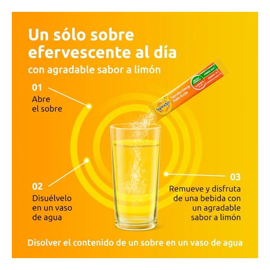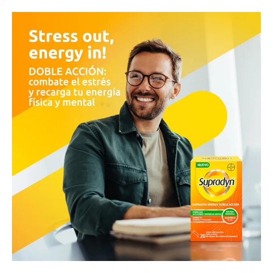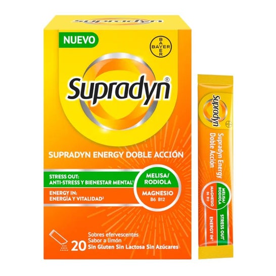 Supradyn Energy Doble Ação 20 Sachês Efervescentes é um complemento alimentar, com sabor a limão, formulado para reduzir o cansaço físico e mental.
