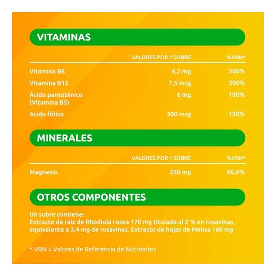 Combina rhodia e melissa, que contribuem para o equilíbrio emocional e para o bem-estar geral, e vitaminas do grupo B, magnésio e outros nutrientes, que ajudam a manter a vitalidade durante o dia.