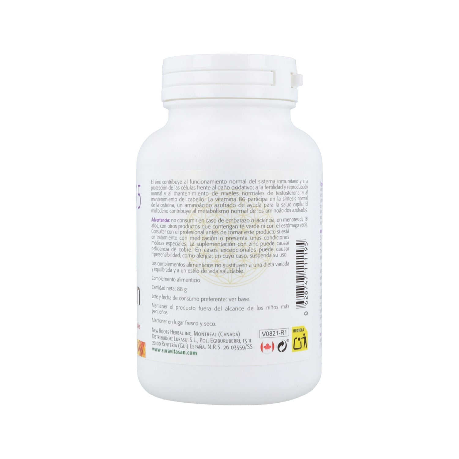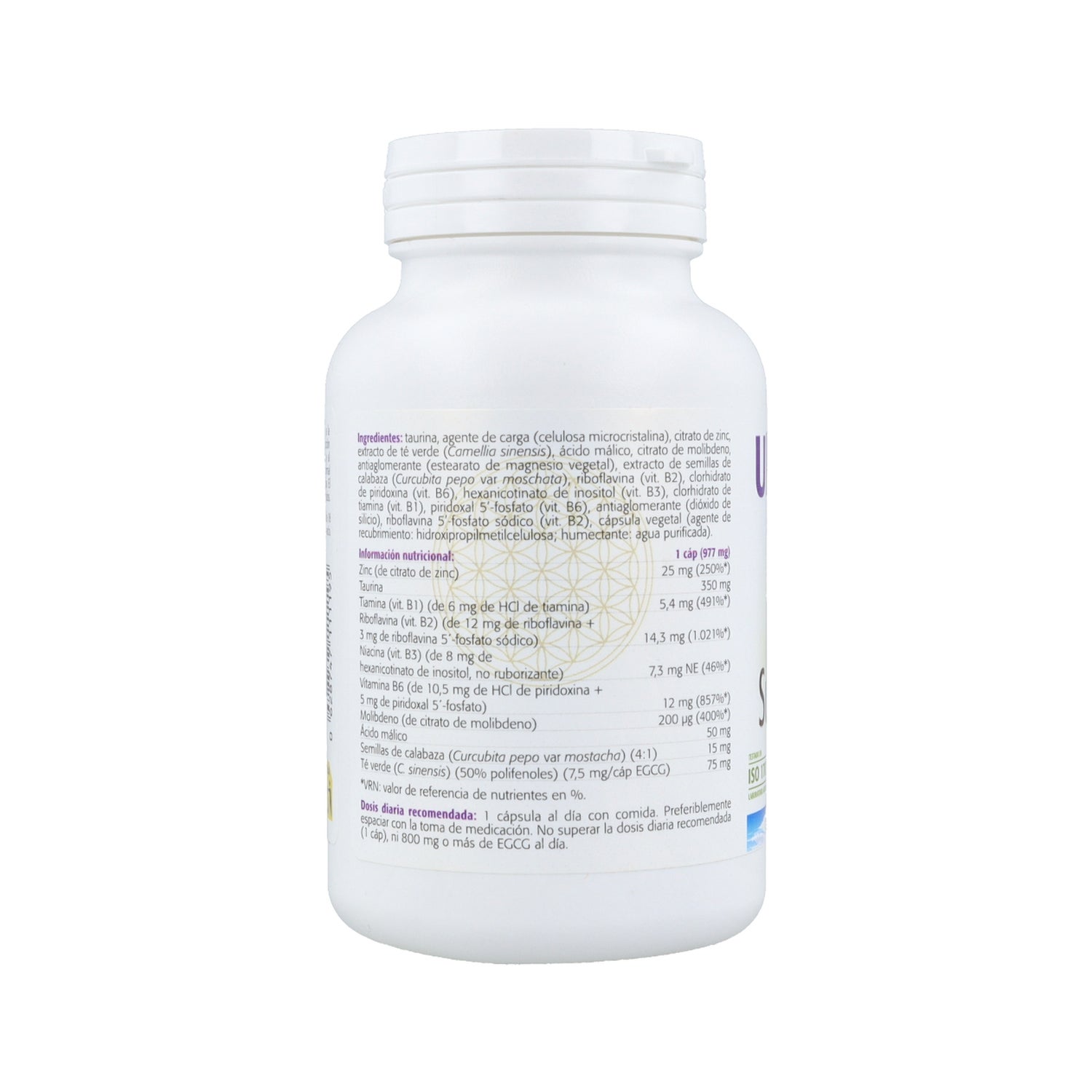 Um suplemento alimentar que fornece ao corpo uma forma de zinco (citrato) com excelente absorção, reforçado com L-Taurina, chá verde, vitaminas B6, B2, B3 e B1, ácido málico, extracto de sementes de abóbora e molibdénio
