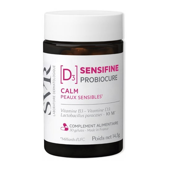 Suplemento alimentar sob a forma de cápsulas de gelatina mole, à base de vitamina D3 e B3 e de uma estirpe probiótica de lactobacillus paracasei, que ajuda a acalmar as peles sensíveis. A estirpe de lactobacillus e a vitamina D3 ajudam a melhorar a saúde intestinal e a reforçar o sistema imunitário, favorecendo uma pele de aspeto mais saudável, enquanto a vitamina B3 ajuda a manter o estado normal da pele.
