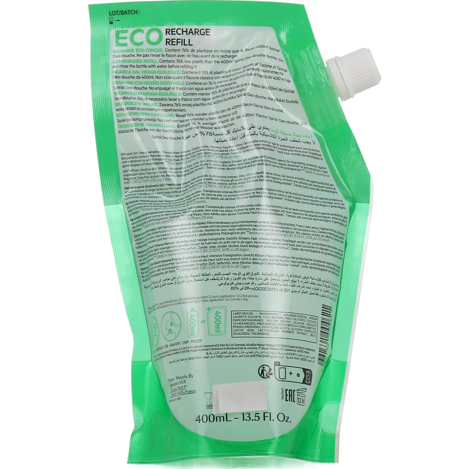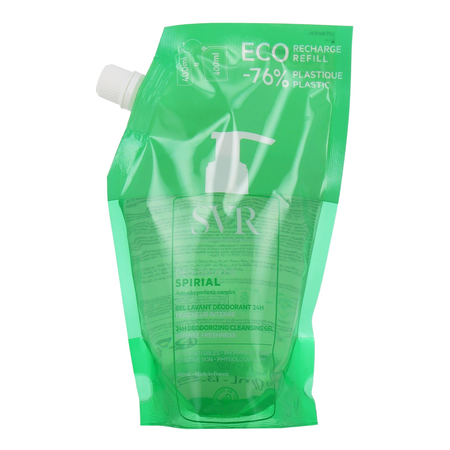 Svr Spirial Déo Douche Gel Limpiador 24H Eco Recarga 400 ml é um gel de ducha que combina propriedades de limpeza e desodorantes, oferecendo uma frescura intensa e uma eficácia durante 24 horas. Este produto foi projetado para combater os odores corporais enquanto mantém o equilíbrio da flora cutânea, sendo adequado até mesmo para peles sensíveis.