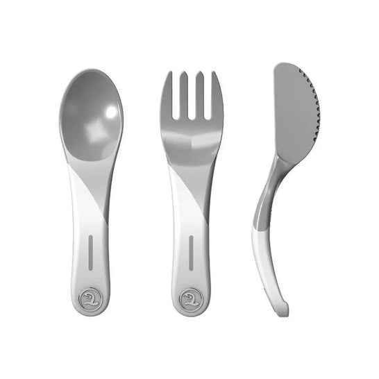 Conjunto de talheres de aprendizagem incluindo colher, faca e garfo em cinza para ajudar no processo de desenvolvimento da alimentação até que as crianças aprendam a comer por conta própria. São feitos de um material macio e fácil de agarrar, que evita mãos escorregadias. Concebido com uma pega muito curta para caber na mão do bebé. Ideal para crianças a partir dos 6 meses de idade.