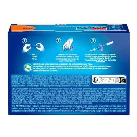 Tampões que actuam como um substituto dos pensos higiénicos, assegurando um maior conforto. Contêm um aplicador retráctil que os torna fáceis de inserir. Além disso, absorve o suficiente para proteger contra fugas ou humidade durante até 4 horas.