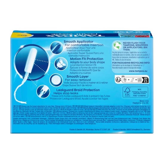 Tampões super absorventes, concebidos para oferecer protecção e discrição durante dias de fluxo leve a moderado. Os tampões apresentam um aplicador de plástico compacto e discreto com uma ponta arredondada para assegurar uma inserção confortável. O desenho tem canais de absorção que captam o fluxo para o núcleo do tampão e a saia de protecção ajuda a evitar fugas.