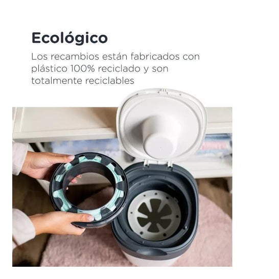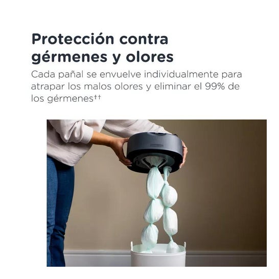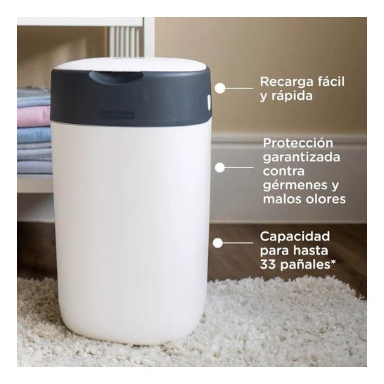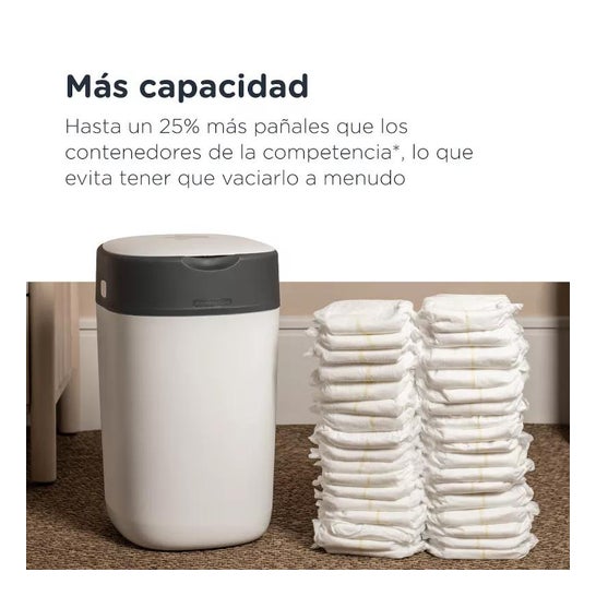 Um êmbolo integrado empurra a fralda para o interior ao fechar a tampa, mantendo as mãos limpas e o ambiente higiênico. Apesar de seu design compacto, tem capacidade para abrigar até 28 fraldas tamanho 1 (de 2 a 5 kg), o que reduz a necessidade de realizar múltiplas viagens ao lixo.