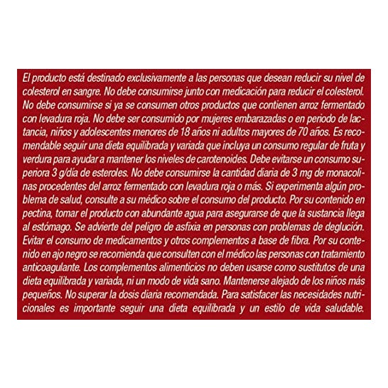Arroz em pó fermentado por levedura vermelha (43,77%), cápsula de gelatina, fitoesteróis de óleo de soja (13,02%), canariose em pó (6,51%), fibra de aveia (6,51%), pectina de maçã (6,51%), extracto seco de alcachofra (3,25%), antiaglomerante: dióxido de silício, vitamina B3 (nicotinamida) (1,17%) e cera de cana de açúcar rica em policosanol (0,32%).