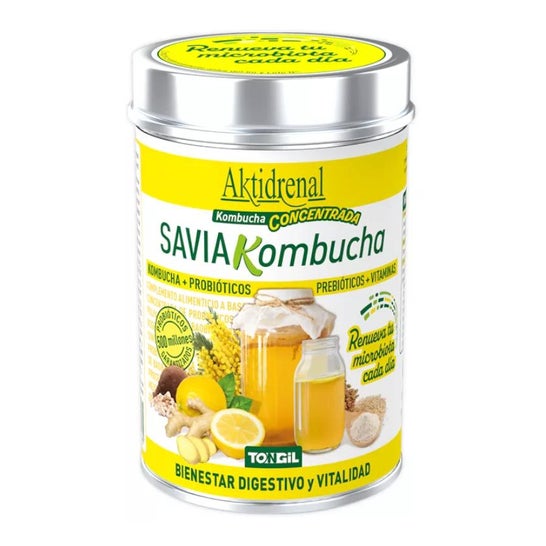 Tongil Savia Kombucha 100g é um suplemento alimentar formulado com concentrado de Kombucha em pó, 9 estirpes probióticas estabilizadas, fibras prebióticas de frutos de Baobá e Acácia e vitaminas 100% vegetais de rebentos de quinoa.
