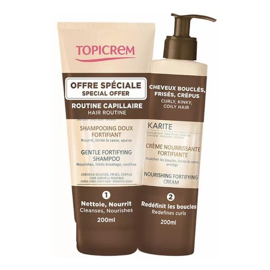 Este conjunto é composto por um xampu e um creme nutritivo, ambos com 200 ml, especialmente concebidos para a higiene e cuidado de cabelos secos, cacheados e crespos.