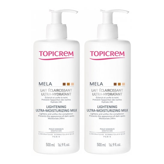Topicrem Mela Lait Unifiant Ultra-Hidratante 2x500ml é uma loção ultra-hidratante que ilumina e uniformiza a tez, prevenindo o aparecimento de manchas escuras enquanto hidrata a pele durante 24 horas.