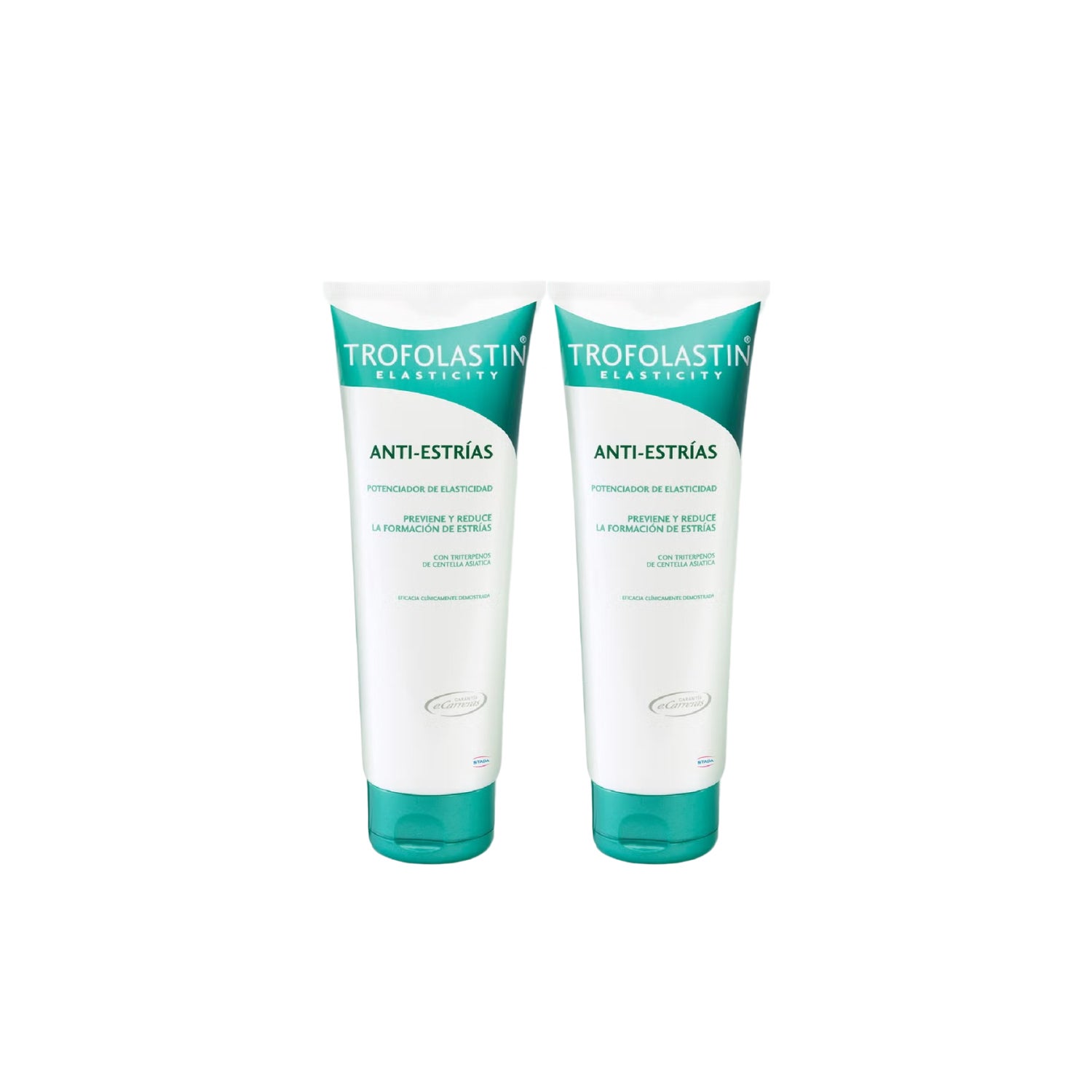 Trofolastín Pack Creme Antiestrias 2x250ml é um creme potenciadora de elasticidade que ajuda a prevenir e reduzir a formação de estrias devido à gravidez, perda de peso, etc.