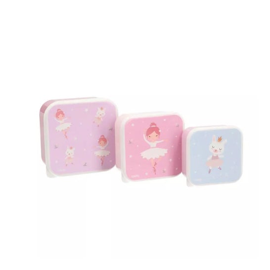 Tutete Set Ballet Lonchera 3uds é um conjunto composto por três caixas projetadas para transportar diferentes tipos de alimentos de maneira organizada. Cada caixa tem um tamanho específico: