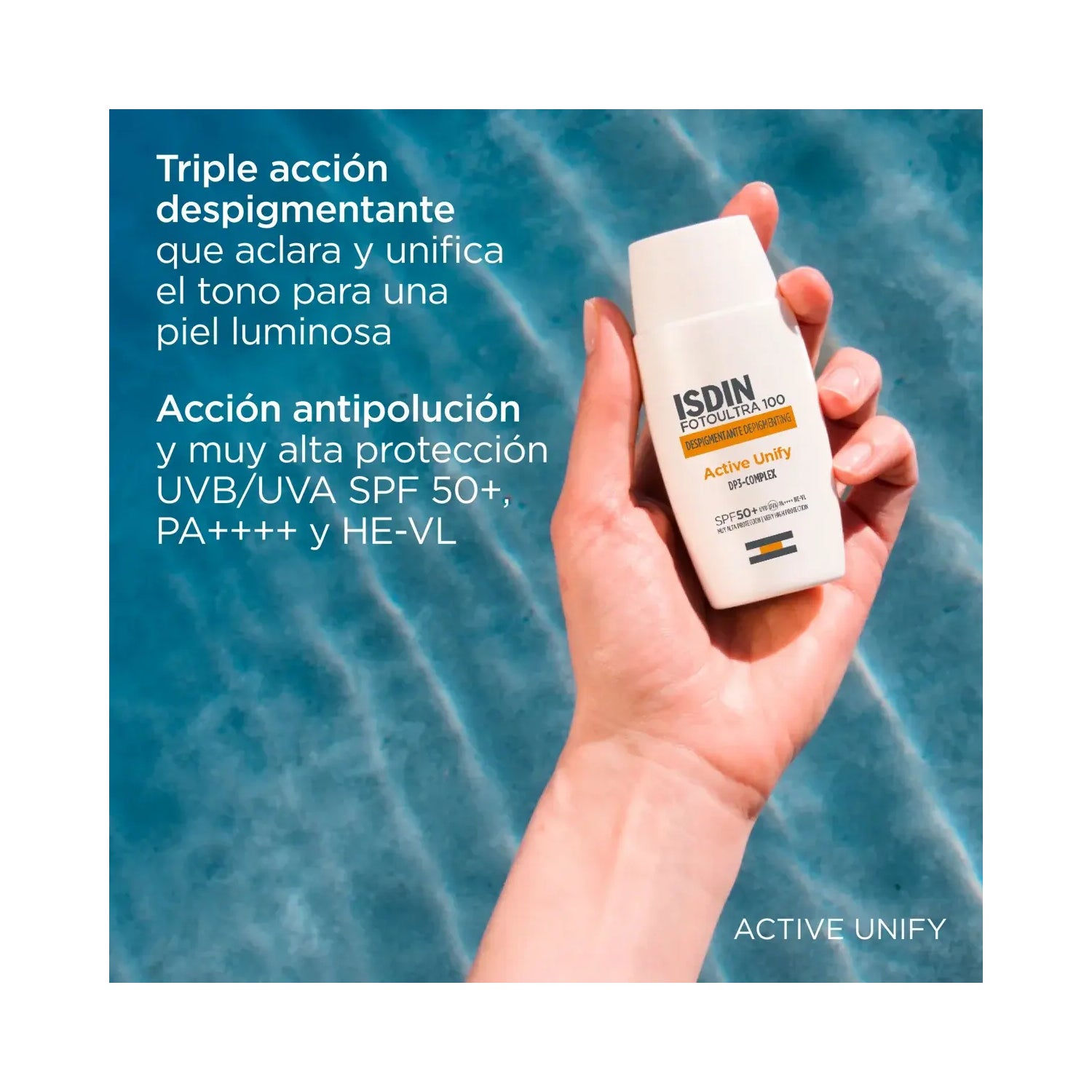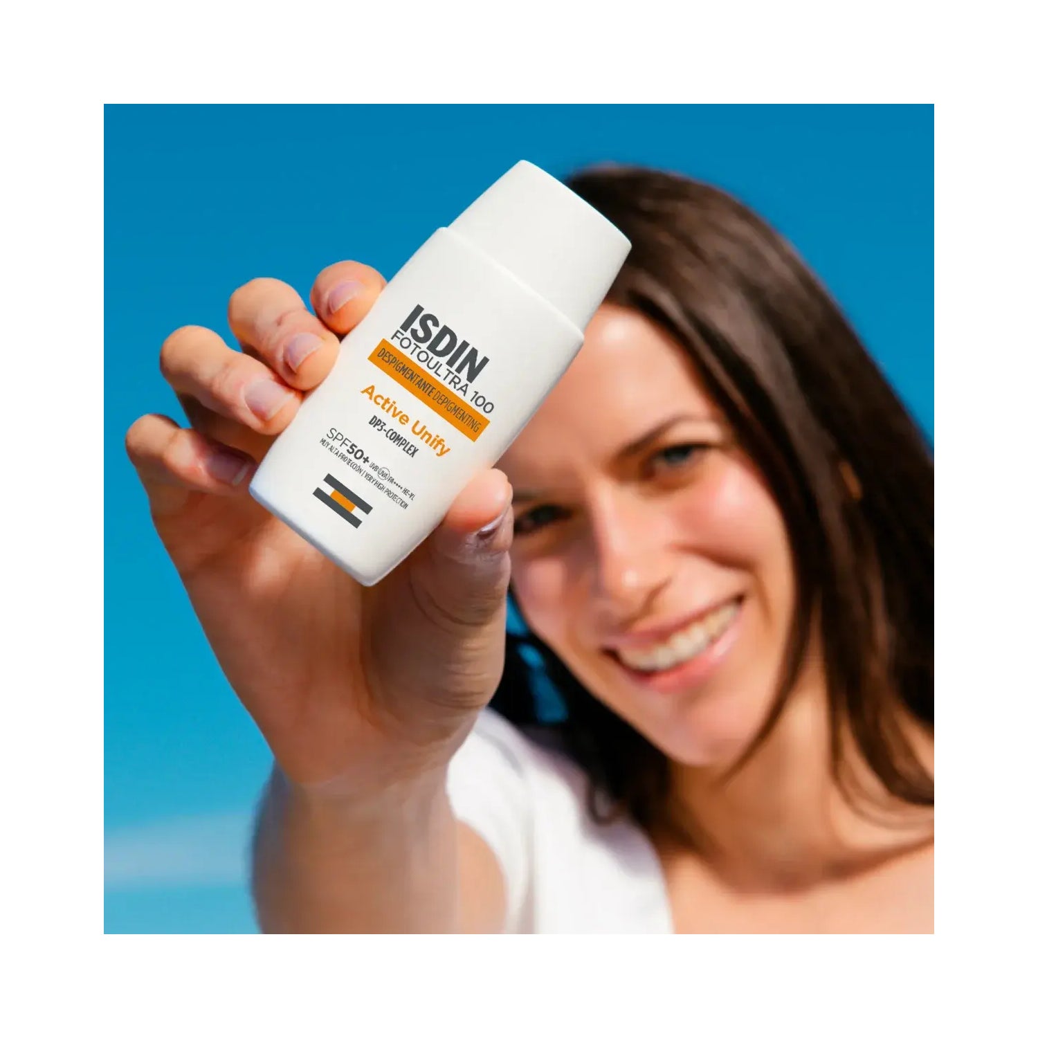 Ultra Photo 100 ISDIN® Active Unify Fusion Fluid SPF 50+ é um protetor solar com um fator de proteção muito elevado que ajuda a reduzir e prevenir o aparecimento de