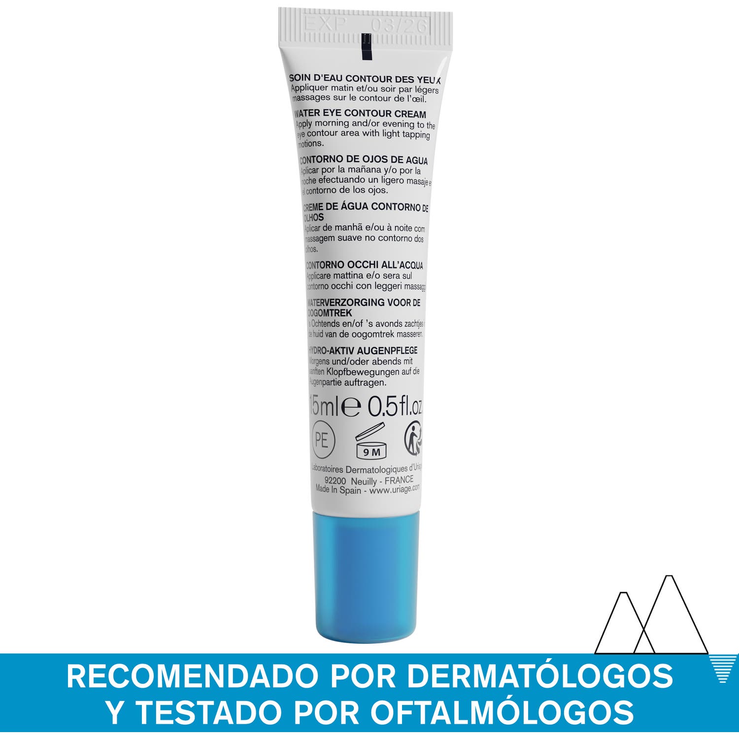Uriage Water Eye Contour 15ml, graças ao seu efeito tensor, favorece uma hidratação contínua da epiderme, restaura o efeito de barreira da pele, limita a sua desidratação e rejuvenesce o aspecto.