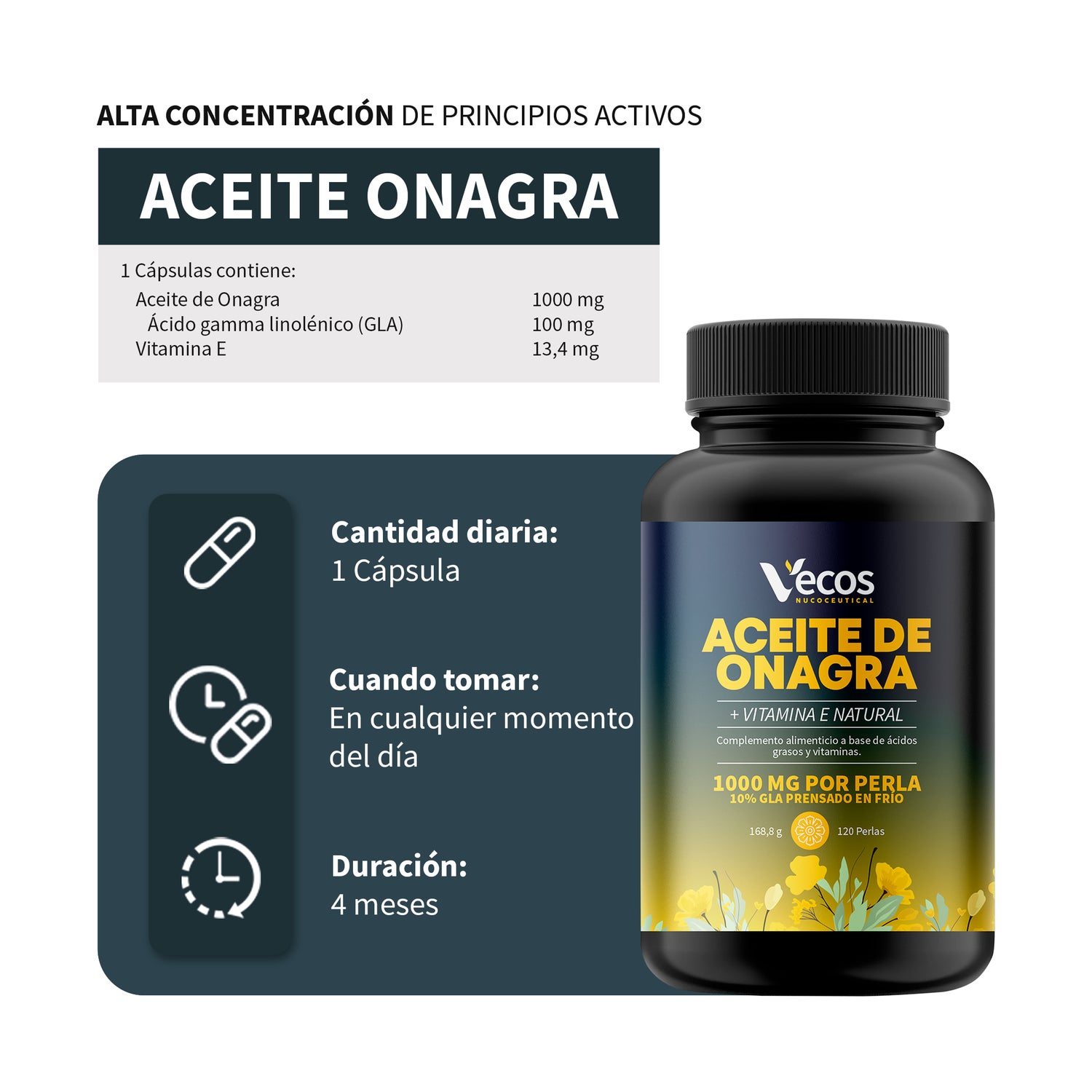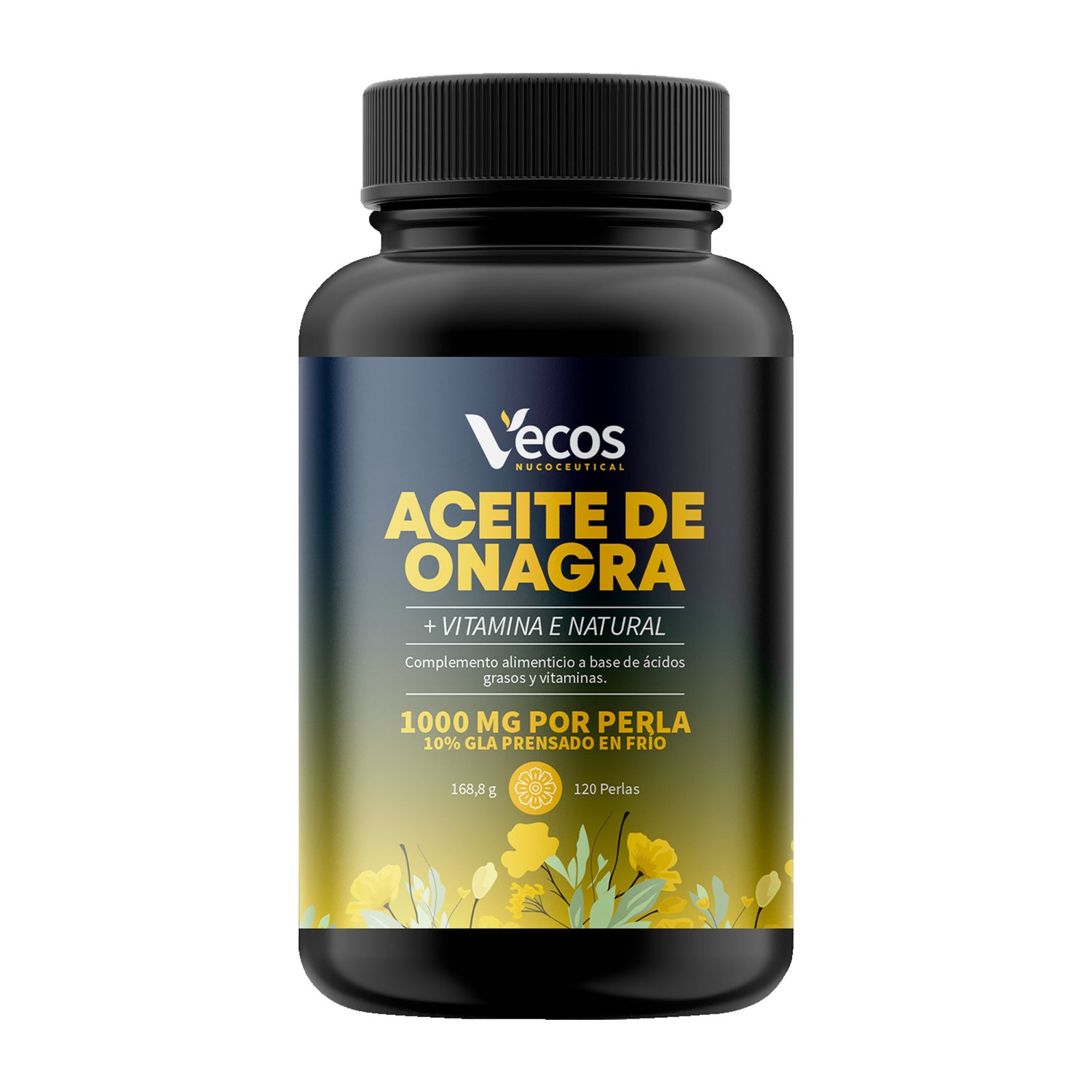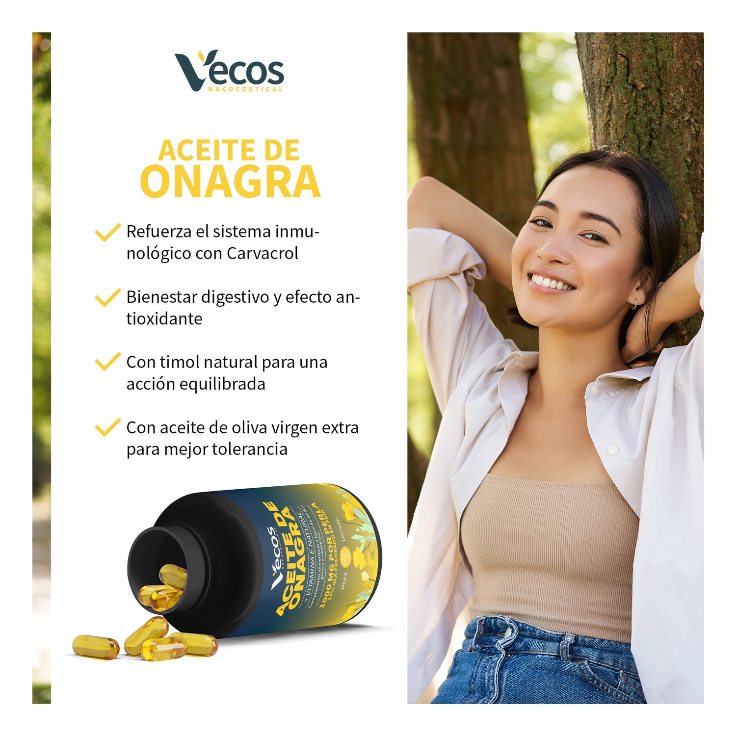 Suplemento alimentar formulado com óleo de onagra e vitamina E como ingrediente antioxidante, indicado para complementar a dieta com ácidos graxos essenciais.