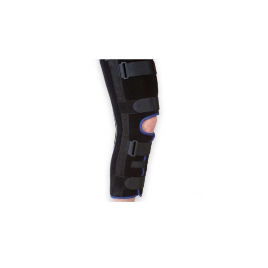 Ortóteses para imobilizar a articulação do joelho numa posição ligeiramente fletida a 17º. Os suportes de alumínio podem ser ajustados individualmente para se adaptarem à anatomia do paciente e facilitar a imobilização. Está indicado para uso em casos de imobilização do joelho em extensão, imobilização pós-cirúrgica, lesão meniscal, osteomielite, etc. Possui uma abertura na rótula. O interior é fabricado em algodão. Tamanho 4 recomendado para pacientes com >200cm de altura.