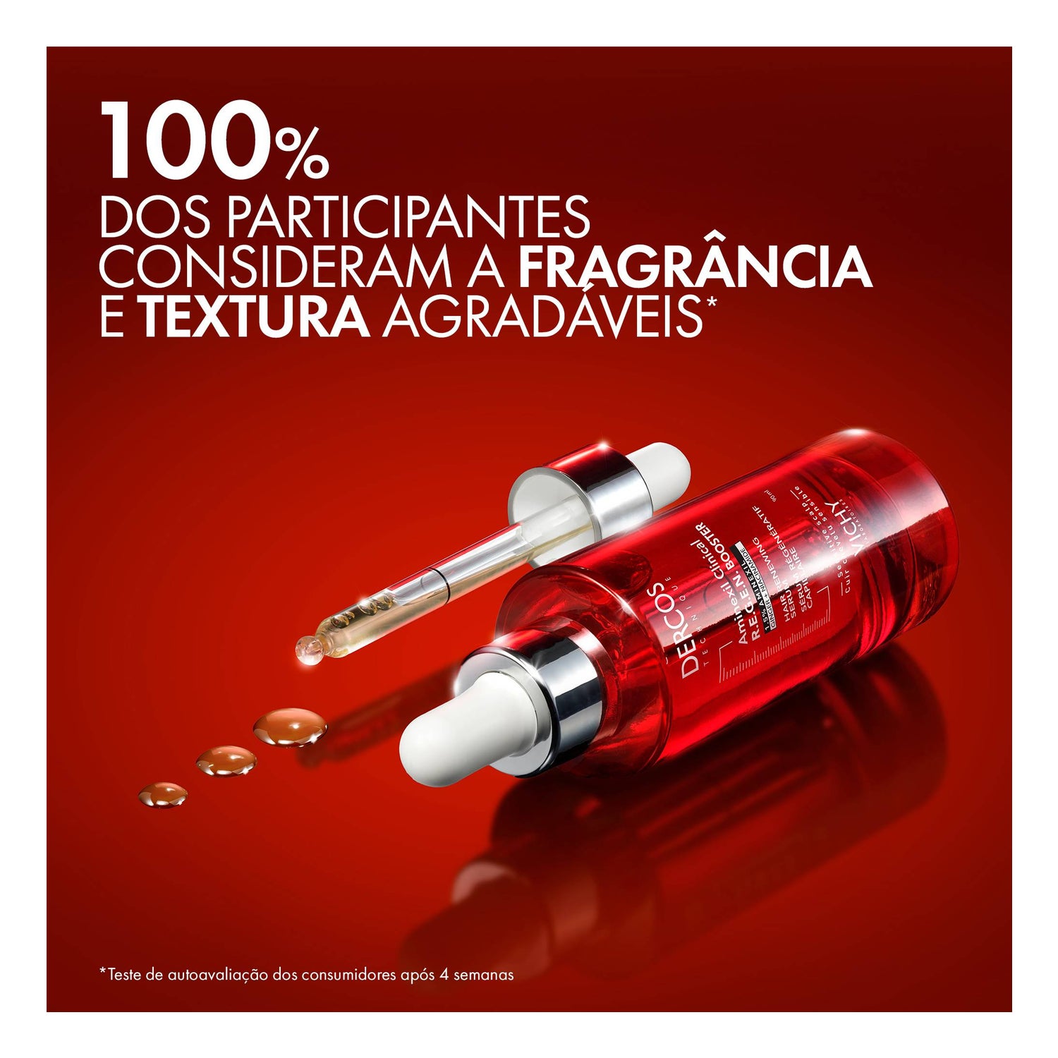 Estudo clínico em 40 mulheres e 37 homens com 5 aplicações semanais durante 12 semanas.*Cabelo existente. ***Teste instrumental com Aminexil Clinical R.E.G.E.N Booster ****Teste instrumental com Shampoo Energy+ + Condicionador + Aminexil Clinical R.E.G.E.N Booster.