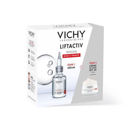Vichy Liftactiv Serum 30ml + Day Cream Spf30 15ml é um conjunto de cuidados faciais adequado a todos os tipos de pele, mesmo aos mais sensíveis. É constituído por Vichy LiftActiv Soro de Preenchimento Epidérmico Supremo H.A. 30ml e Creme Diurno Supremo SPF30 15ml. Por um lado, o creme de dia ajuda a reduzir o aparecimento de rugas e linhas finas, graças à sua fórmula com ácido hialurónico, com um efeito de plumping progressivo. Também ajuda a proteger a pele da acção dos raios solares e da acção dos radicais livres graças à sua combinação de filtros fotoestáveis SPF30. Além disso, este kit inclui o soro com ácido hialurónico puro que ajuda a reduzir a visibilidade das rugas mais profundas e a dar elasticidade ao rosto.