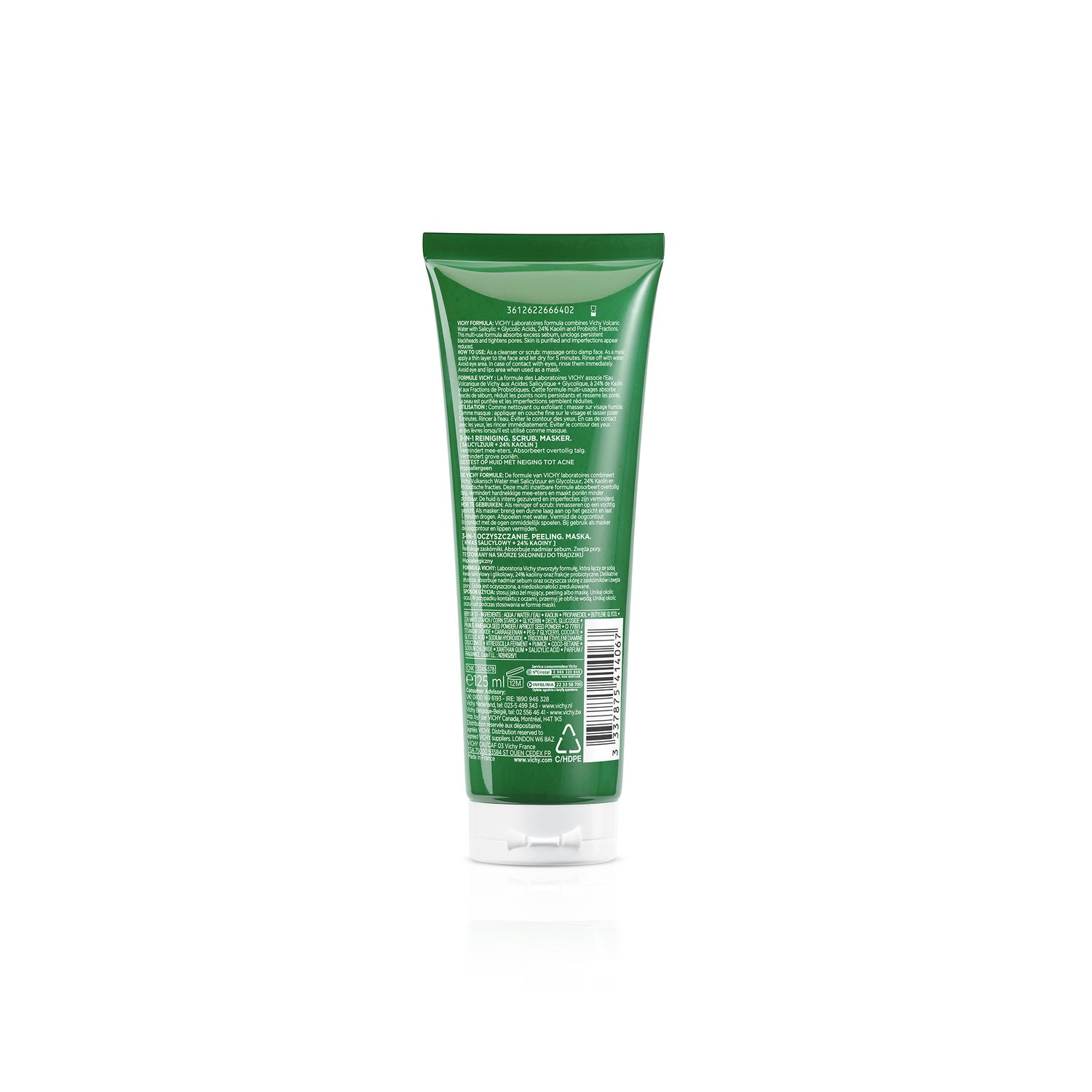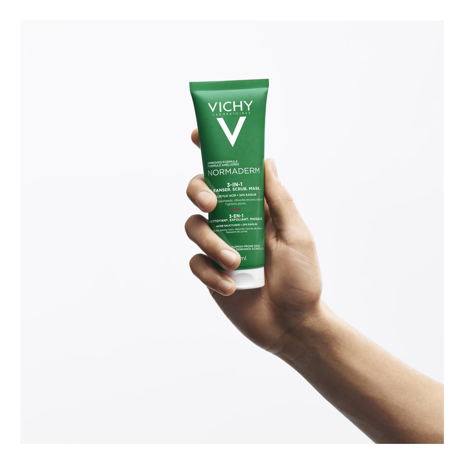 Vichy Normaderm 3 em 1 Cleanser Exfoliating Mask 125ml é um produto de limpeza que proporciona uma tripla ação de higiene, protegendo a sua pele das imperfeições e da sujidade acumulada. Por um lado, actua como desmaquilhante, esfoliante e máscara.