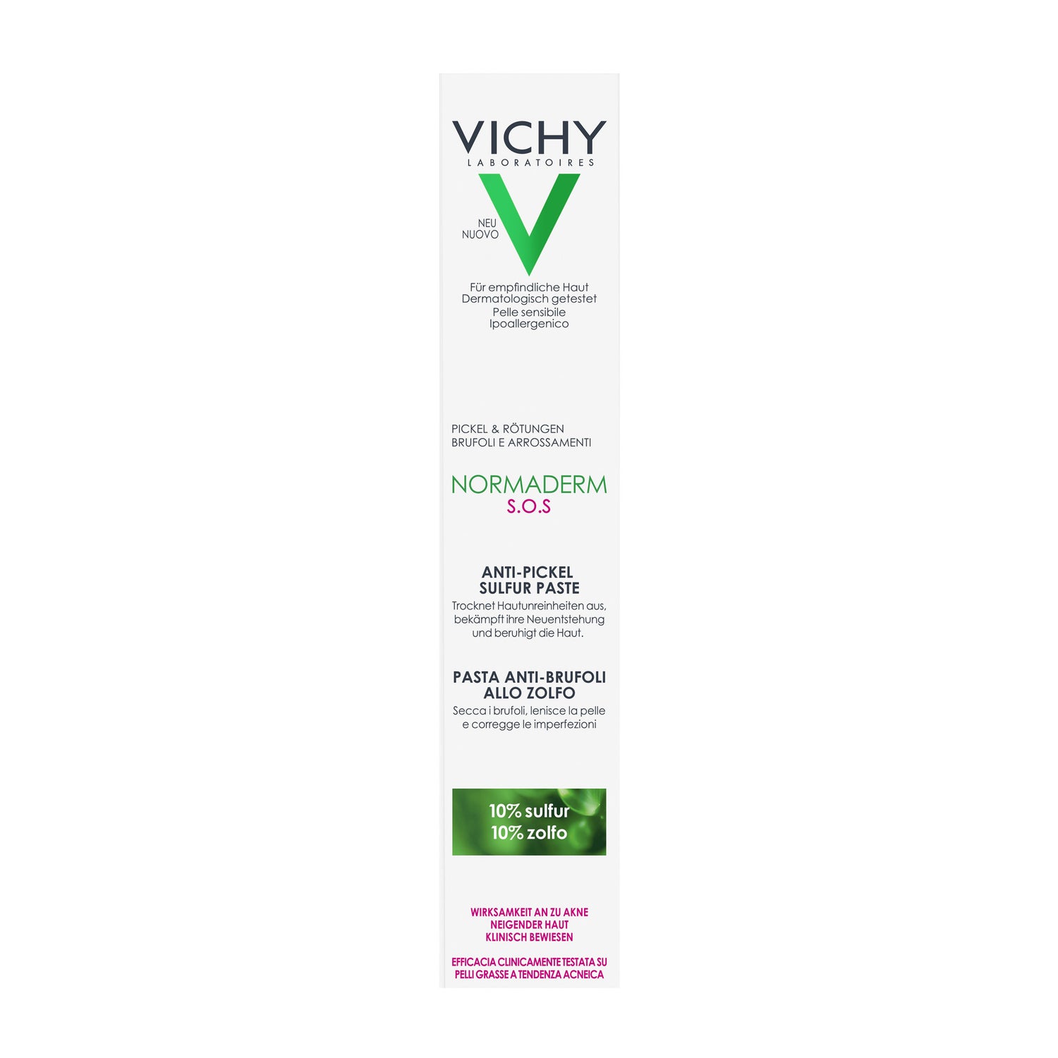 Vichy Normaderm SOS Pasta Anti-Espinhas com Enxofre 20ml é um produto de tratamento localizado para as borbulhas que ajuda a secar, reduzir e curar rapidamente as manchas. Elaborada com 10% de enxofre. Além disso, contém também niacinamida, um poderoso ingrediente calmante e regulador da secreção sebácea, e ácido glicólico, que aumenta a renovação celular para prevenir novas marcas, e é indicado para acalmar e reduzir o aparecimento de borbulhas.