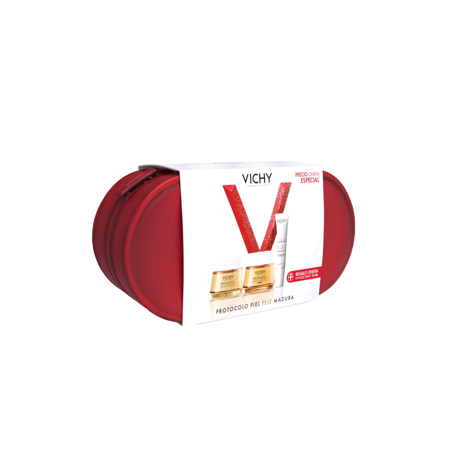 Vichy Pack Necessaire Protocolo Pele Madura 50ml + 50ml + 15ml é um conjunto projetado para atender às necessidades específicas da pele madura, especialmente durante e após a menopausa. Este pack inclui três produtos essenciais: