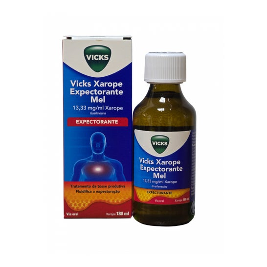 Vicks Xarope Expectorante Mel contém a substância ativa guaifenesina e está indicado no tratamento da tosse produtiva (tosse com expetoração).