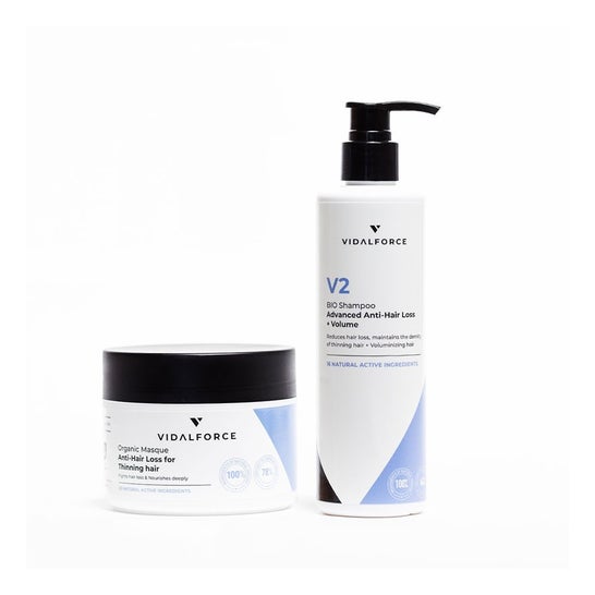 Vidalforce Pack Champô V2 + Máscara Anti-Queda Avançada Bio é uma solução avançada projetada para combater a queda de cabelo e devolver força e densidade. Este pack é ideal para pessoas com cabelo enfraquecido ou que sofrem de perda excessiva, proporcionando resultados visíveis e duradouros.