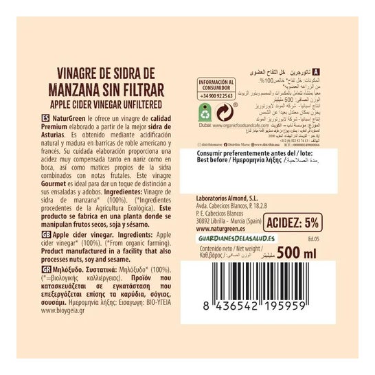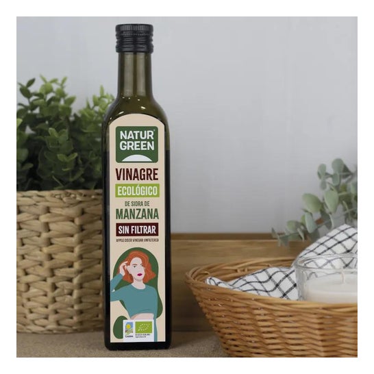 Vinagre de maçã não filtrado Bio apresentado pela Naturgreen. O produto é apresentado em uma embalagem de 500ml. Este produto é produzido de forma orgânica 100% natural. Devido ao seu baixo teor calórico, é um excelente companheiro para a dieta diária. Contribui para os tratamentos de perda de peso e favorece a diminuição dos níveis de colesterol. Suas características naturais permitem que seu uso seja muito variado. É apropriado para acompanhar receitas como saladas. Pode ser utilizado para desinfecção e limpeza devido à sua capacidade bactericida. Graças à sua composição livre de açúcares adicionados, juntamente com suas propriedades, é benéfico para equilibrar os níveis de açúcar no sangue. Pode ser consumido por pessoas com intolerância ao glúten e a qualquer momento do dia. Uma vez aberto, deve ser mantido em local fresco.