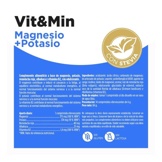 Vit&Min magnésio + potássio é um suplemento alimentar que contribui para reduzir a fadiga. Seus principais ingredientes são o magnésio e o potássio; em primeiro lugar, o magnésio favorece o correto funcionamento muscular reduzindo o cansaço.