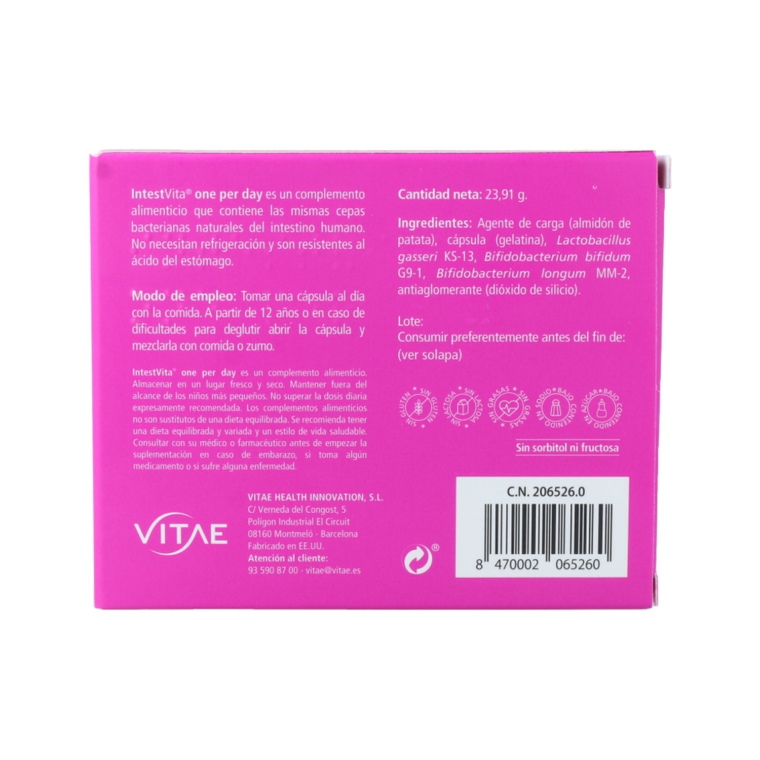 Vitae IntestVita One per Day 30caps é um suplemento alimentar que ajuda a regenerar a flora intestinal. Inclui probióticos para equilibrar a saúde do intestino. Não contém glúten, lactose ou gorduras.