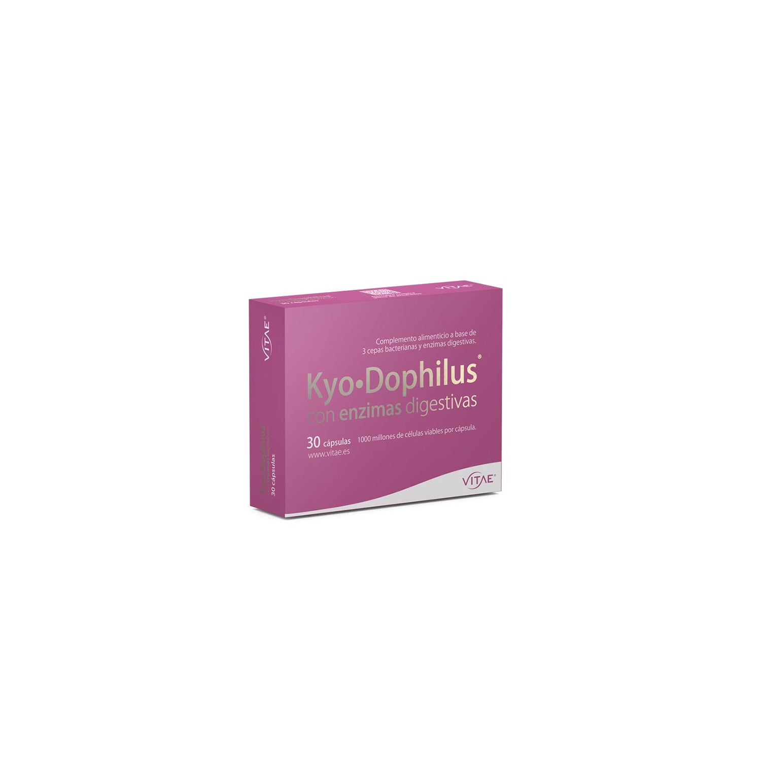 Vitae Kyo Dophilus com Enzimas Digestivas 30caps é um suplemento alimentar para adultos que combina três estirpes bacterianas presentes no intestino humano(Lactobacillus gasseri, Bifidobacterium bifidum e Bifidobacterium longum) com quatro enzimas digestivas(lipase, lactase, protease e amilase) exercendo um efeito probiótico sobre o organismo.