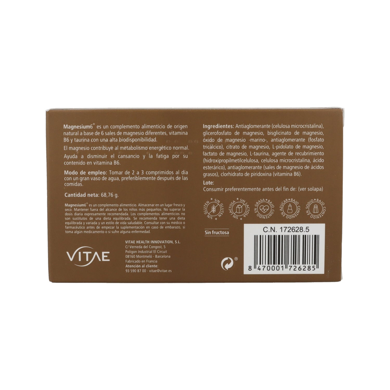 Vitae Magnesium6 60comp é um suplemento alimentar que contém 6 sais de magnésio combinados com vitamina B6 e taurina.