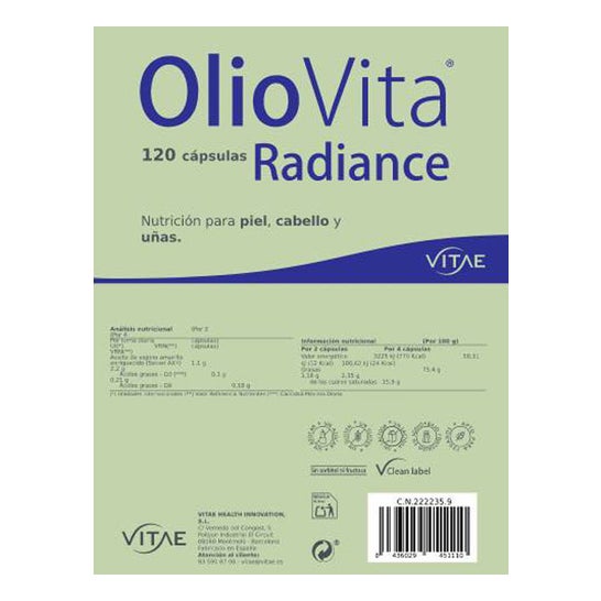 OlioVita Radiance é um suplemento antioxidante natural formulado com óleo de espinheiro-marítimo rico em ômega 7, 3, 6 e 9 e o exclusivo complexo SevenAX®. Nutre de dentro para fora, melhorando a hidratação, elasticidade e luminosidade da pele, ao mesmo tempo que fortalece o cabelo e as unhas.