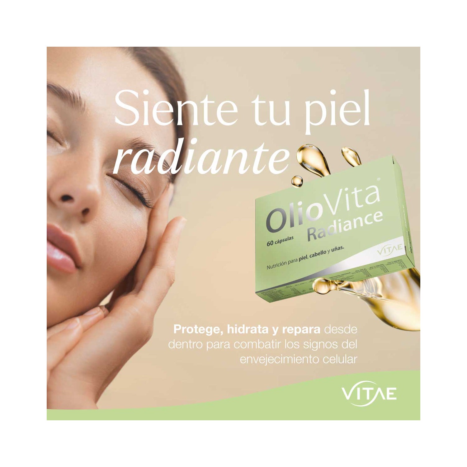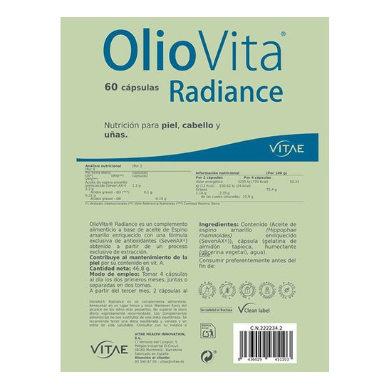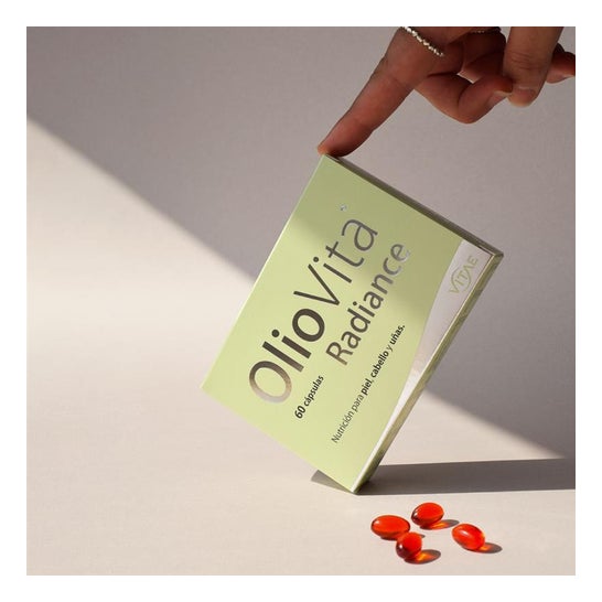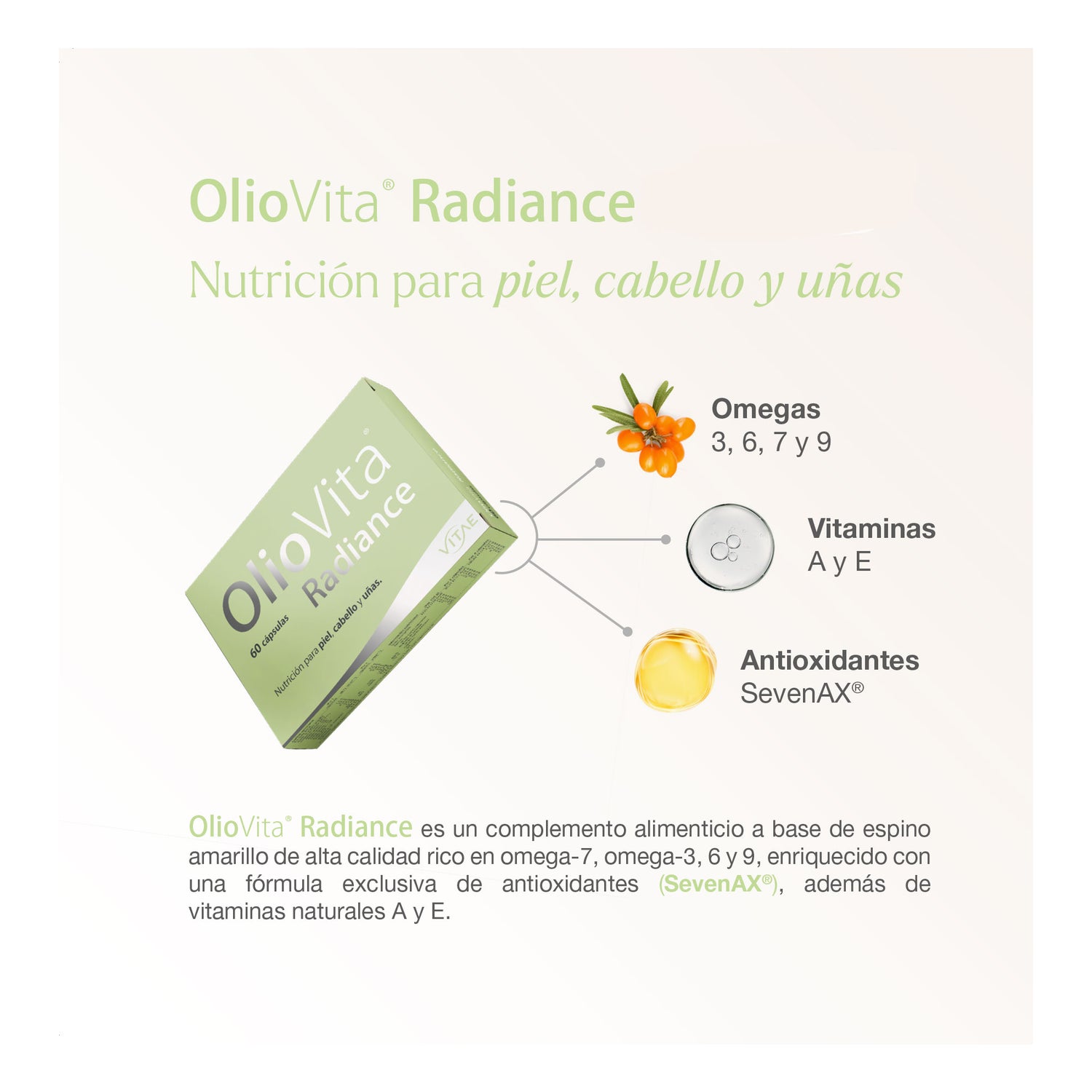 OlioVita Radiance é um suplemento antioxidante natural formulado com óleo de espinheiro amarelo rico em ômega 7, 3, 6 e 9 e o exclusivo complexo SevenAX®. Nutre de dentro para fora, melhorando a hidratação, elasticidade e luminosidade da pele, ao mesmo tempo que fortalece o cabelo e as unhas.