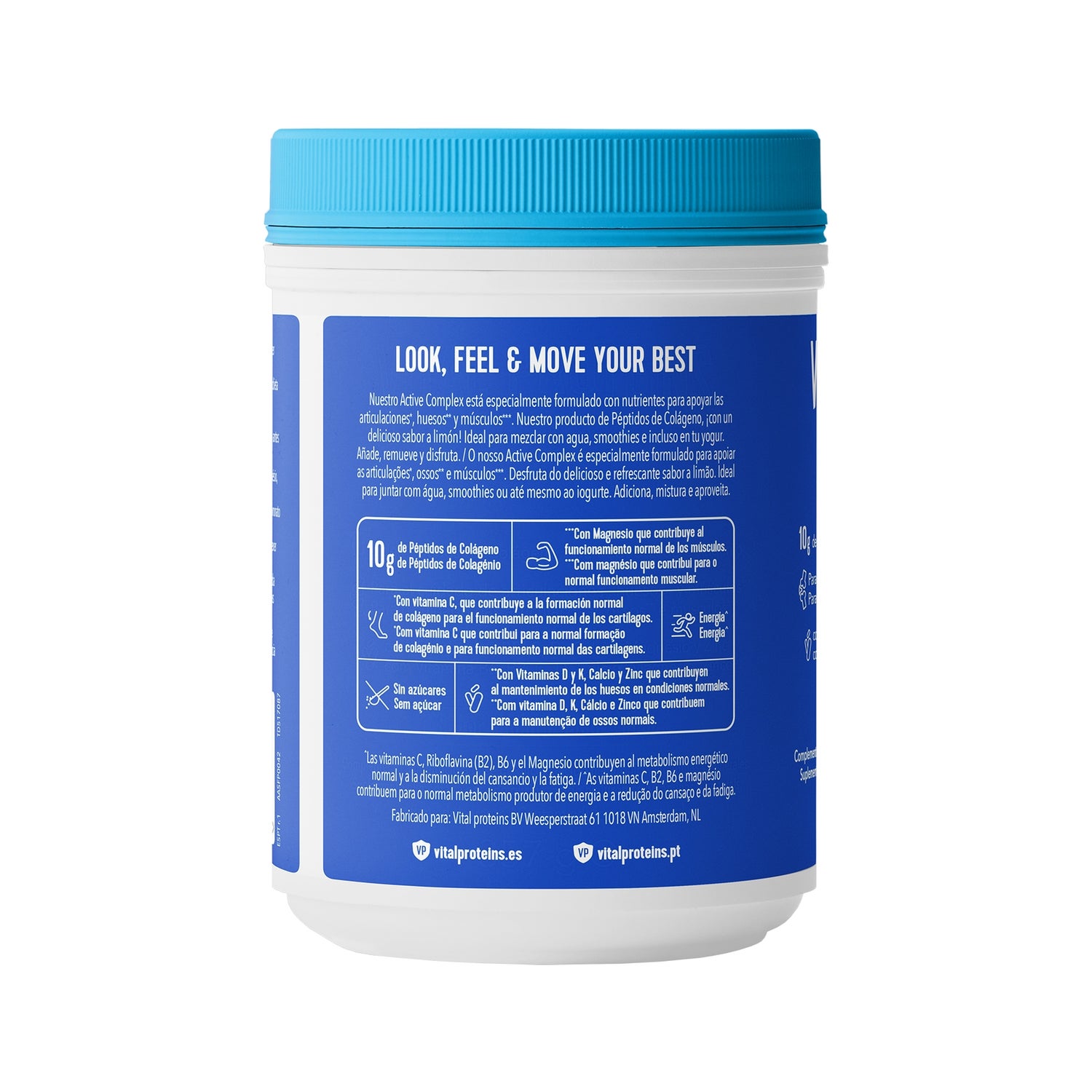 Vital Proteins Active Complex é composto por peptídeos de colágeno, cálcio, magnésio, zinco, riboflavina, vitamina B6, C, D, ácido hialurônico e glicina.