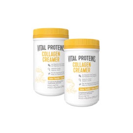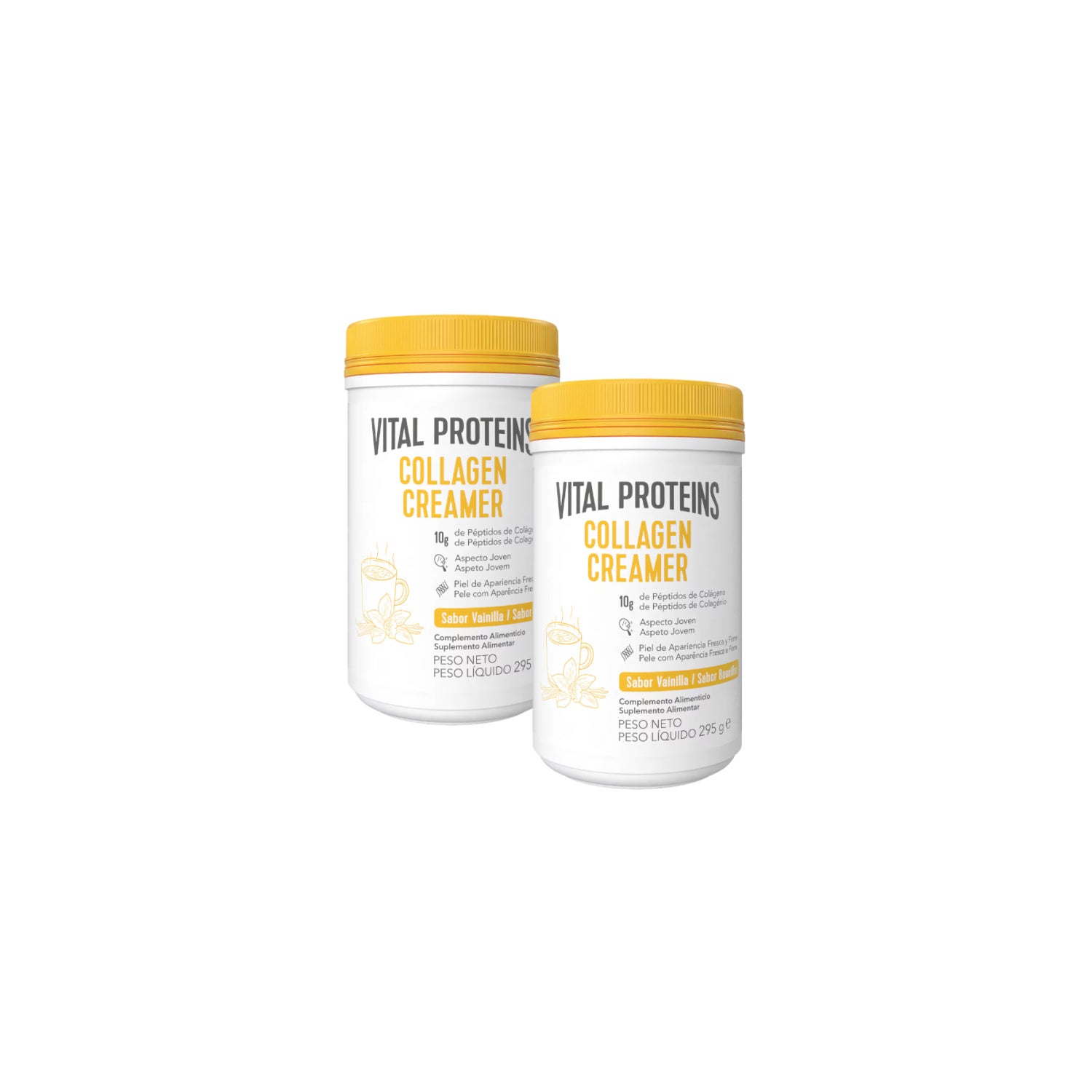 Vital Proteins Pack Collagen Creamer Peptídeos de Colágeno Baunilha 2x295g é um suplemento alimentar à base de colágeno e leite de coco, que favorece o bom estado do cabelo, da pele, das unhas e das articulações.