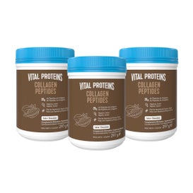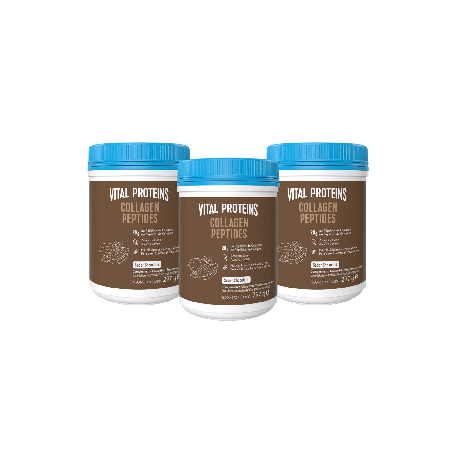 Vital Proteins Pack Collagen Peptides Péptidos de Colágeno Chocolate 3x297g é um complemento alimentar que contribui para fortalecer a pele e o cabelo.