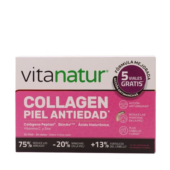 Vitanatur Collagen Antiaging Skin Regeneration 30 vials é um suplemento alimentar formulado com colagénio e ácido hialurónico. Apresenta-se em frascos bebíveis com sabor a frutos vermelhos.
