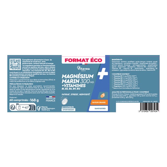 Suplemento alimentar à base de magnésio marinho e vitaminas B.