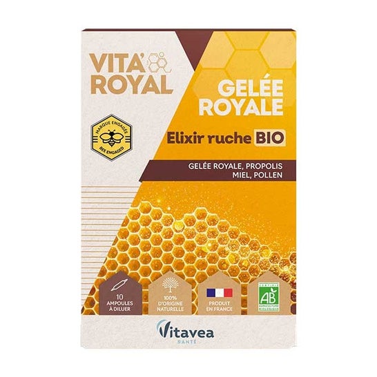 Vitavea Vita'Royal Jalea Real Elixir de Colmena Bio 10 Ampolas é um complemento projetado para fortalecer as defesas e revitalizar o organismo de maneira natural. Cada ampola contém 1800 mg de geleia real ecológica, o que a torna especialmente adequada para fornecer energia e reforçar o sistema imunológico. É um aliado essencial em épocas de mudanças de estação, fadiga ou convalescença.