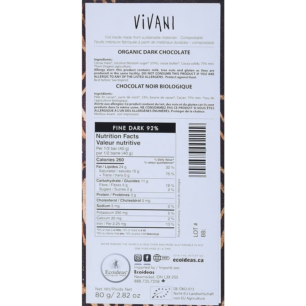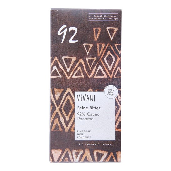 Vivani Panama Chocolate Negro 92% 80 gr é uma barra de chocolate ecológico de 80 g elaborada com 92% de cacau puro do Panamá e adoçada com açúcar de flor de coco. Oferece um sabor suave com notas de caramelo e um perfil aromático equilibrado, com menor amargor apesar de sua intensidade.