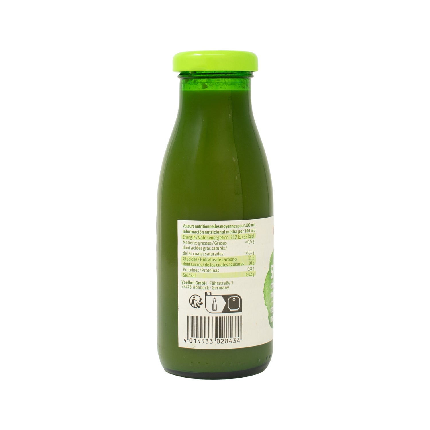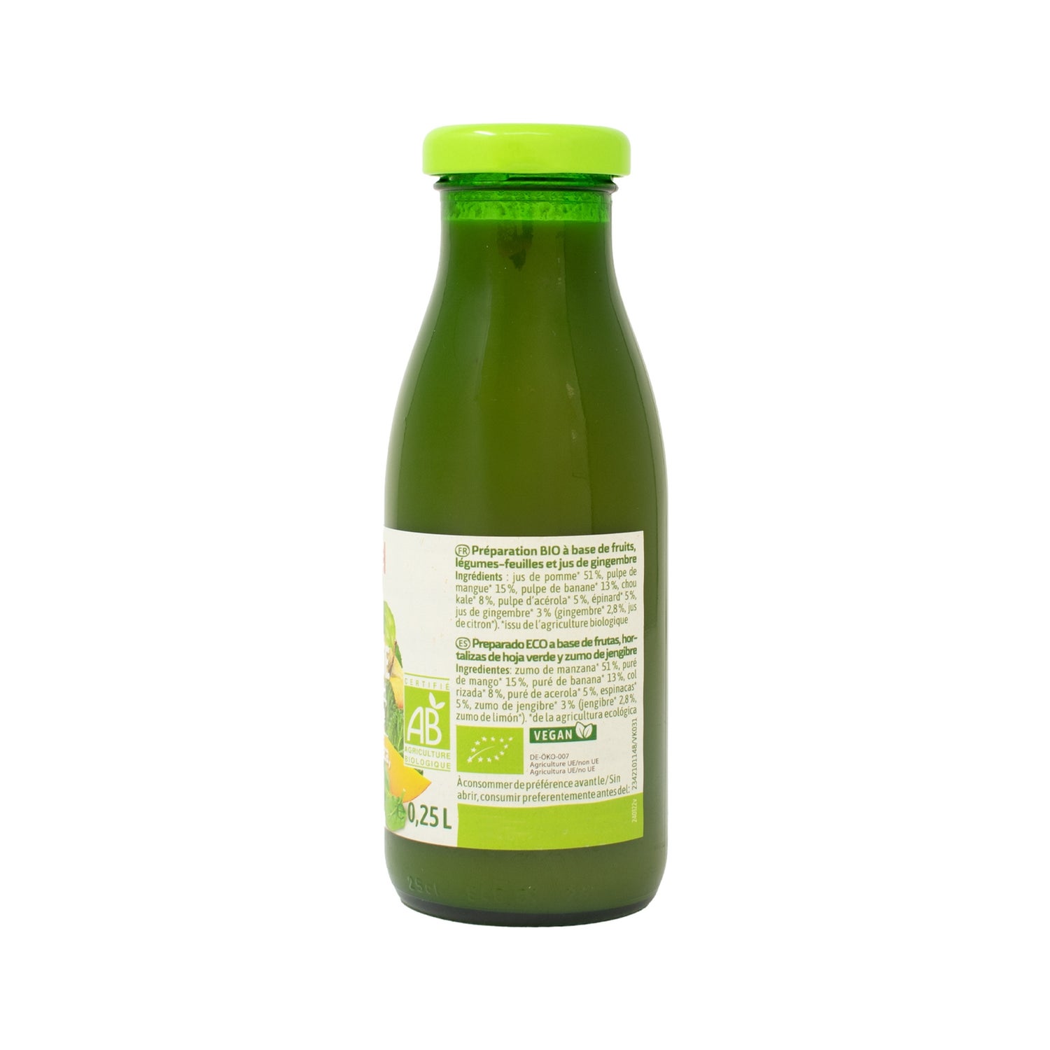 Delicioso e saudável smoothie verde, feito de manga, gengibre, couve e espinafre, de cultivos orgânicos com qualidade certificada Demeter®, que proporciona múltiplos benefícios para o organismo.