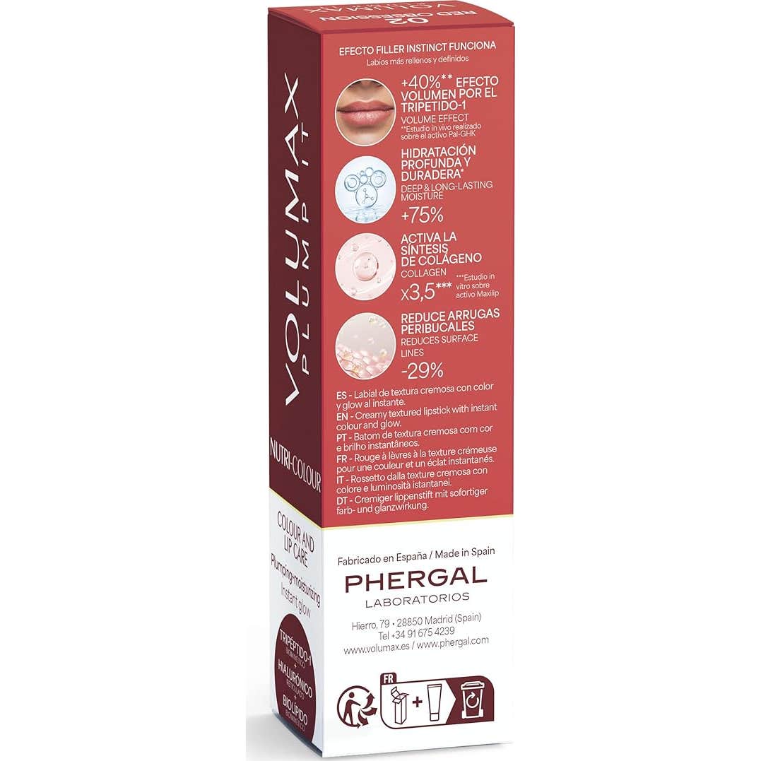 Volumax Plump It Nutri Color 02 Red Obsession é um tratamento labial antienvelhecimento que atua como um preenchedor sem agulhas, projetado para oferecer um cuidado completo aos lábios.