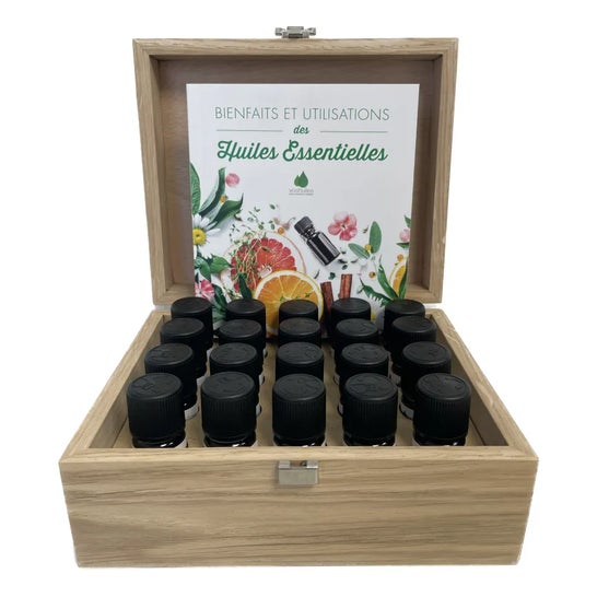 A caixa, elaborada em Borgonha, conta com 20 compartimentos projetados para conservar e proteger os óleos essenciais da luz e dos impactos. Além disso, inclui um livro intitulado "Benefícios e usos dos óleos essenciais", que fornece informações sobre as propriedades dos óleos e receitas para sua utilização.