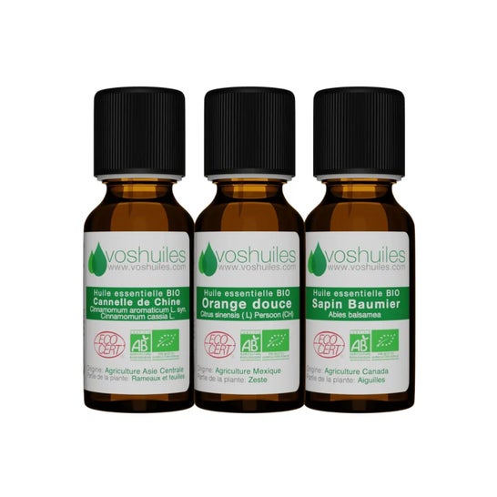Voshuiles Kit Os 3 Óleos Essenciais Aromas Natalinos Bio é uma seleção projetada para criar um ambiente festivo em casa durante a temporada natalina. Este kit inclui três óleos essenciais de alta qualidade:
