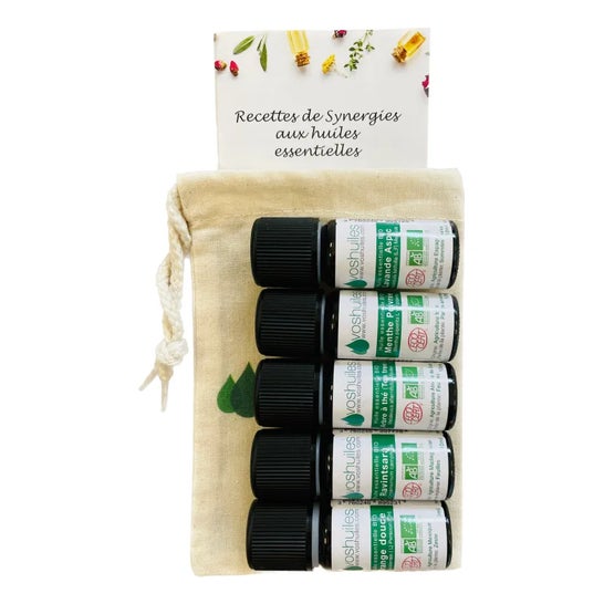 O kit é apresentado em um prático bolsa de algodão natural que protege as garrafas da luz, facilitando seu transporte. Além disso, inclui um pequeno livreto que oferece receitas e sugestões de misturas, o que é útil para descobrir os benefícios desses óleos na sua vida cotidiana.