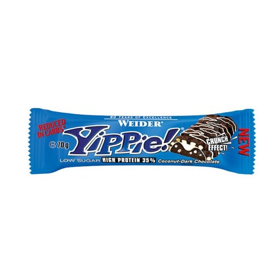 Weider Yippie Barrinha Energética Coco Chocolate Amargo 70g é uma barrinha proteica projetada para atletas e pessoas ativas que desejam satisfazer suas necessidades diárias de proteínas sem sacrificar o sabor. Oferece 26 gramas de proteína por unidade e é uma opção baixa em carboidratos, ideal como lanche ou para depois do treino.