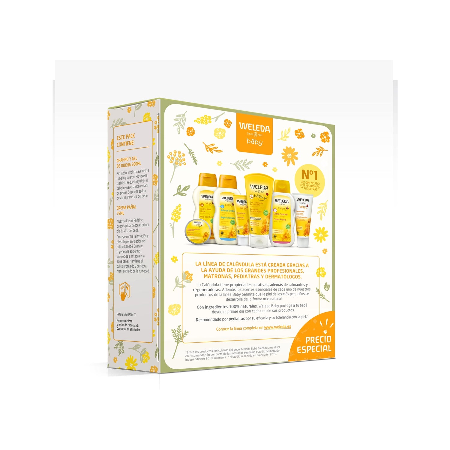 Weleda Baby Pack The Essentials for your Baby é um conjunto de produtos da linha Weleda Calendula que proporcionam cuidados 100% naturais para a pele do bebé. Este pack inclui o Champô e Gel de Duche 2 em 1 Calêndula Bebé, que limpa suavemente o cabelo e o corpo sem sabão, protegendo a pele da secura e deixando o cabelo macio e fácil de pentear. Contém também o Creme para Fraldas Baby Calendula, que acalma e regenera a pele irritada na zona da fralda, mantendo o rabinho do bebé protegido da humidade.