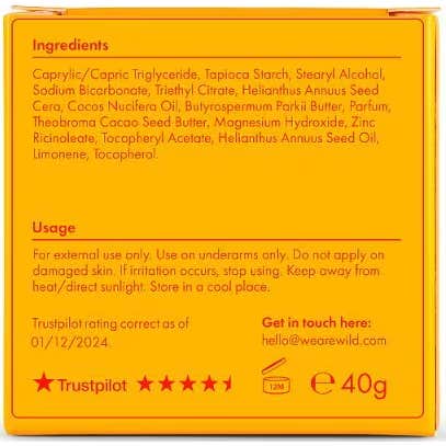 Este desodorante é completamente livre de plástico e cloreto de alumínio, o que o torna uma alternativa respeitosa com o meio ambiente. Além disso, é vegano e não foi testado em animais, o que assegura seu compromisso com o bem-estar animal. É compatível com o estojo reutilizável de alumínio da marca Wild, promovendo assim um uso sustentável.